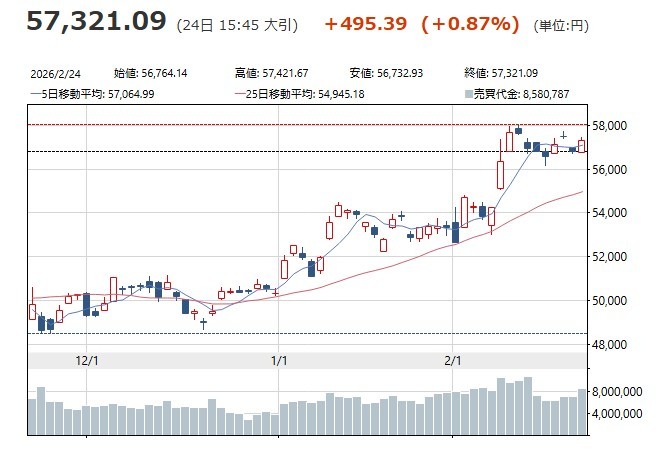 이날 닛케이225평균주가지수는 전일 종가보다 0.87%(495.39엔) 상승한 5만7321.09엔에 거래를 마쳤다. 도쿄증권거래소주가지수(TOPIX, 토픽스)도 0.20%(7.50포인트) 오른 3815.98포인트로 마감했다.
