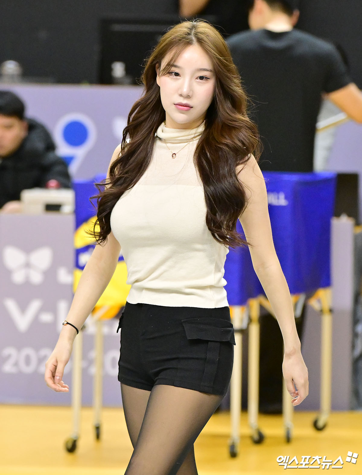 (엑스포츠뉴스 의정부, 김한준 기자) 24일 오후 경기도 의정부 경민대체육관에서 열린 '진에어 2025-2026 V-리그' KB손해보험과 삼성화재의 경기, 경기 전 김현영 치어리더가 리허설에 임하고 있다.