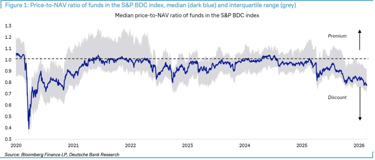 S&P BDC 지수 구성 펀드의 NAV 대비 주가 비율 중앙값 추이 [자료=도이체방크] |