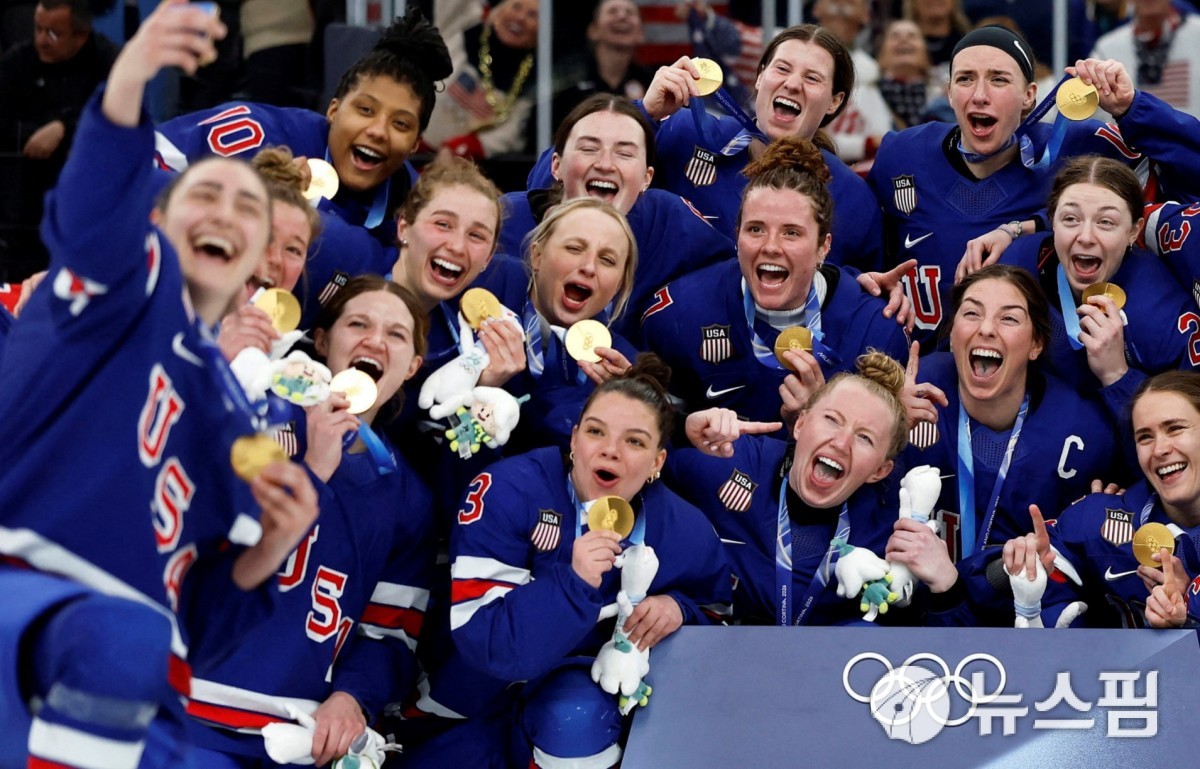 [밀라노 로이터=뉴스핌] 박상욱 기자= 미국 여자 아이스하키 대표팀 선수들이 지난 19일(한국시간) 캐나다와 밀라노 동계올림픽 결승전을 마치고 금메달을 목에 걸고 단체 사진 촬영을 하고 있다. 2026.2.24 psoq1337@newspim.com |