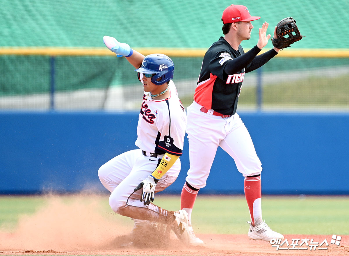 (엑스포츠뉴스 오키나와(일본), 고아라 기자) 24일 일본 오키나와 카데나 구장에서 열린 KIA 타이거즈와 WBC 대표팀의 연습경기, 1회말 무사 1,2루 대표팀 김도영 타석 때 안현민이 2루로 진루하고 있다.