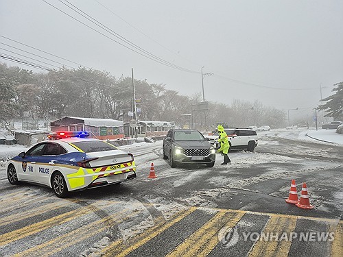 (울산=연합뉴스) 장지현 기자 = 24일 울산에도 눈이 내려 일부 도로가 통제되고 있다.
