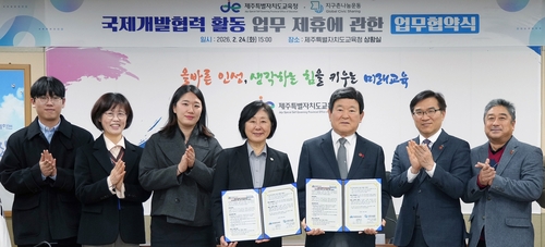 (제주=연합뉴스) 김호천 기자 = 제주도교육청은 ㈔지구촌나눔운동과 국제개발협력 업무협약을 체결하고, 제주의 친환경 학교급식 시스템을 해외에 공유하기로 했다고 24일 밝혔다.
