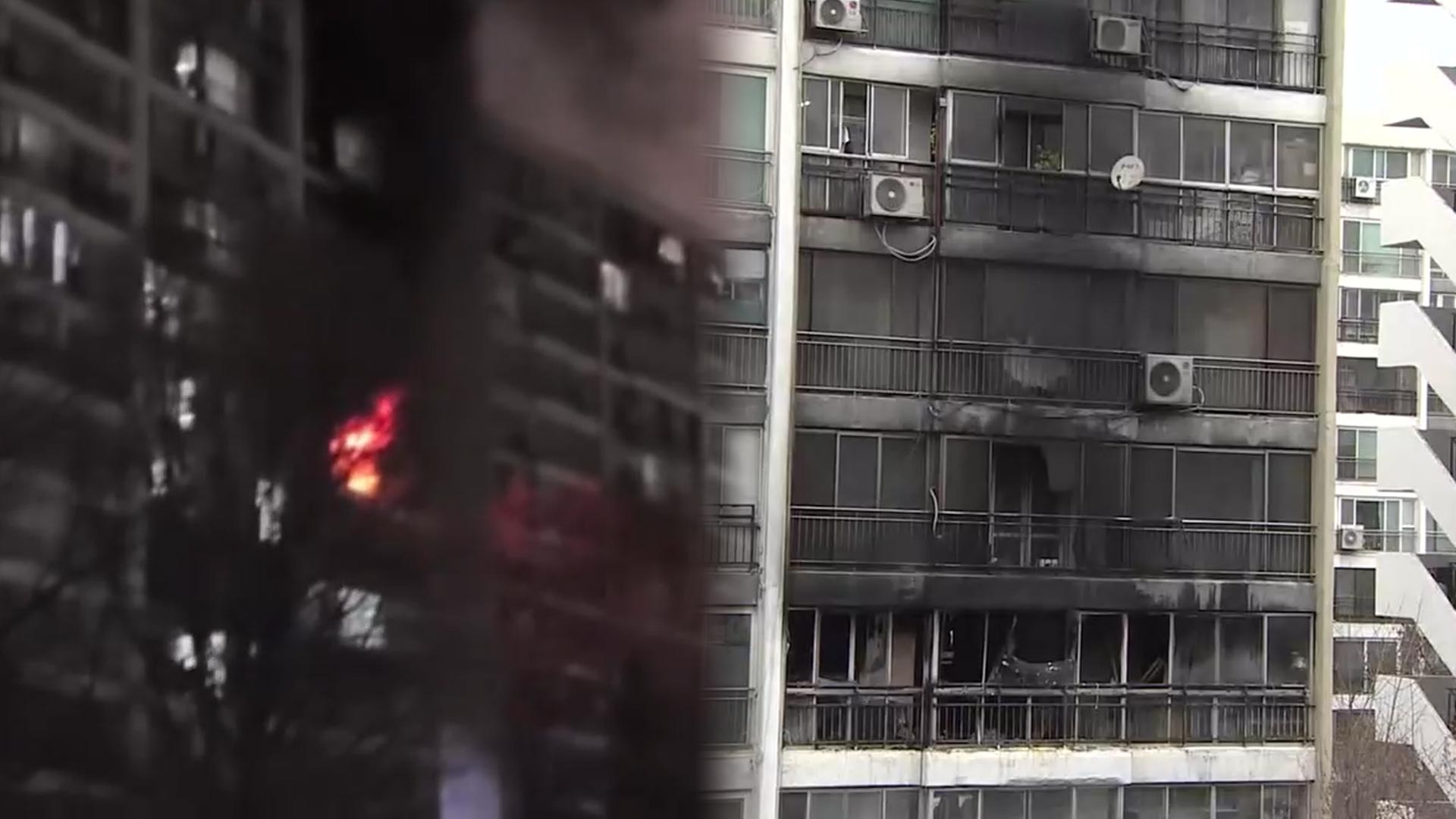 화재로 아파트 외벽은 시커멓게 그을렸고 유리창도 산산조각 났습니다.