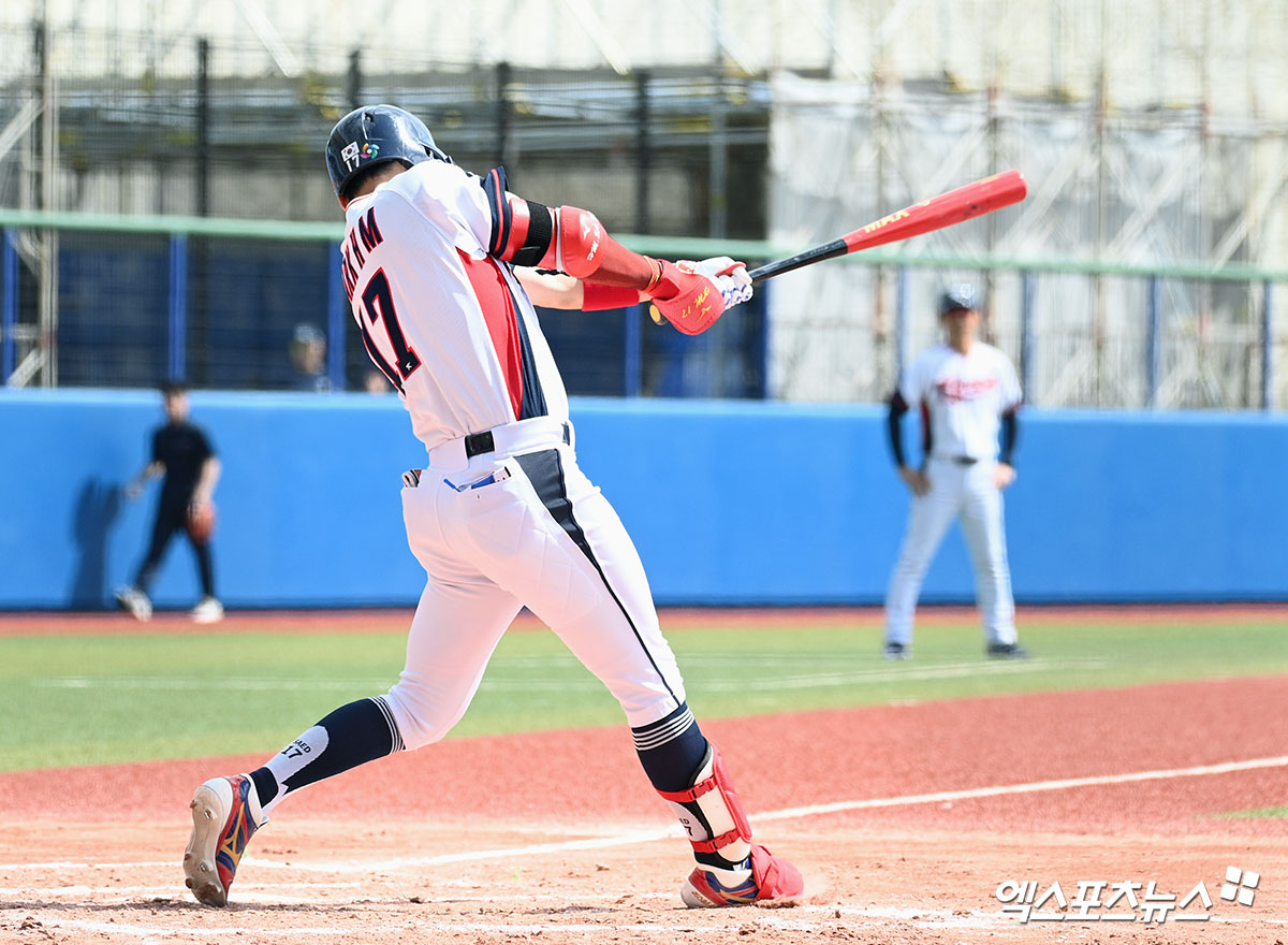 (엑스포츠뉴스 오키나와(일본), 고아라 기자) 24일 일본 오키나와 카데나 구장에서 열린 KIA 타이거즈와 WBC 대표팀의 연습경기, 2회말 대표팀 선두타자 박해민이 안트를 날리고 있다.