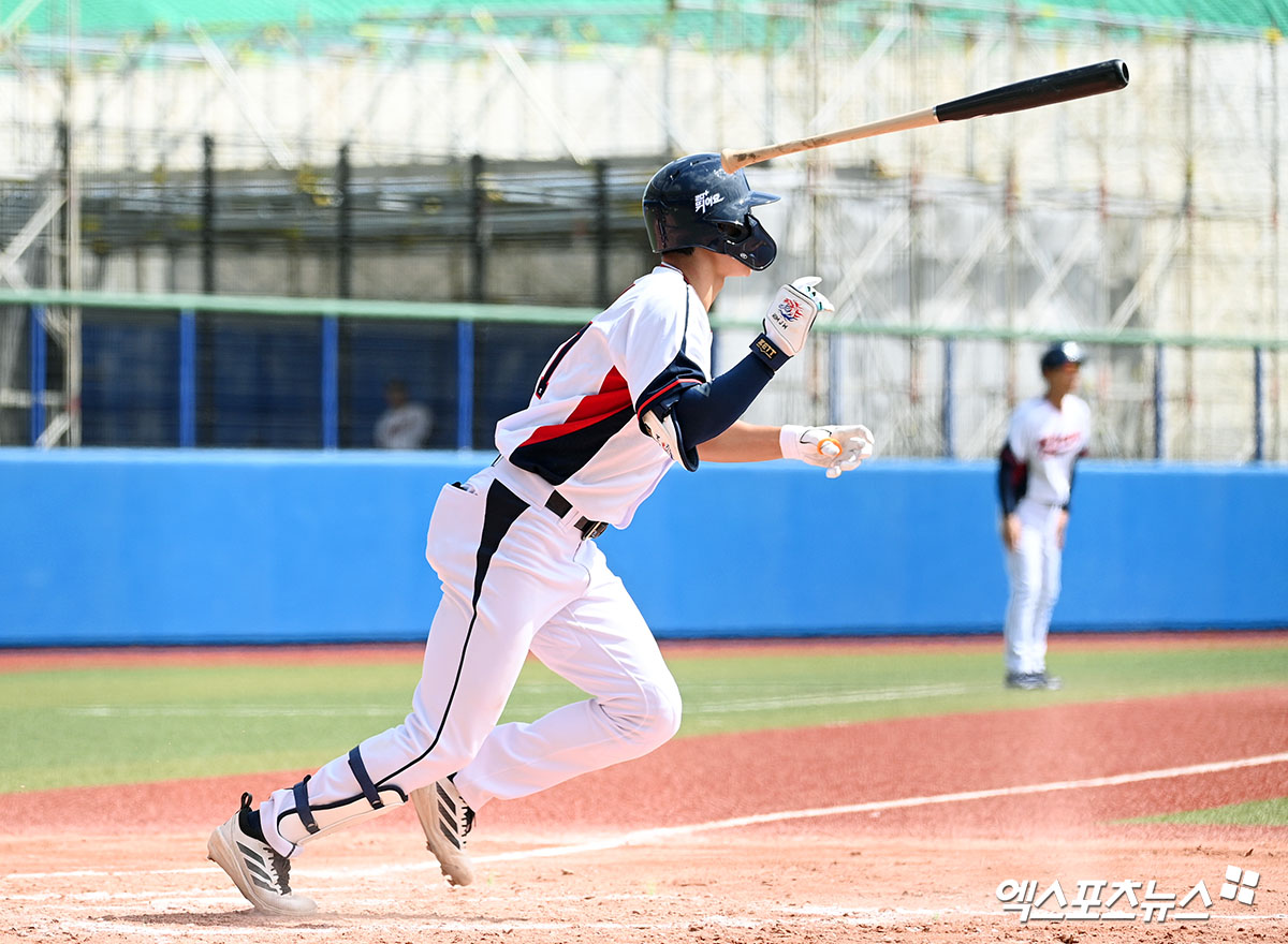 (엑스포츠뉴스 오키나와(일본), 고아라 기자) 24일 일본 오키나와 카데나 구장에서 열린 KIA 타이거즈와 WBC 대표팀의 연습경기, 2회말 2사 3루 대표팀 김주원이 안타를 날리고 있다.