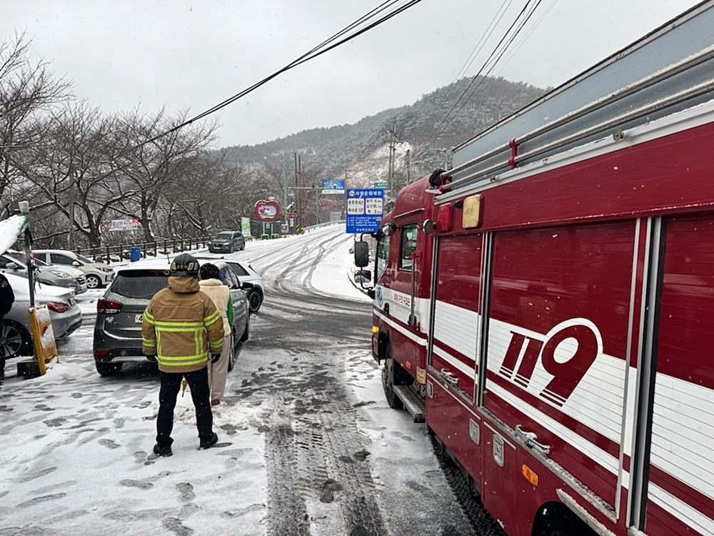 경북 북동산지와 내륙, 동해안 남부지역에 24일 오후 2시20분을 기해 대설특보가 발효되면서 많은 눈이 내리고 있는 가운데 경북소방당국이 청도군 각북면 한 도로에서 안전조치하고 있다.[사진=경북소방본부]2026.02.24 nulcheon@newspim.com |