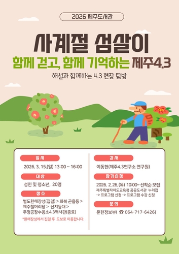(제주=연합뉴스) ▲ 제주도서관, '해설과 함께하는 4·3 현장 탐방' 운영 = 제주도서관은 3월 15일 청소년과 성인을 대상으로 '사계절 섬살이: 해설과 함께하는 4·3 현장 탐방' 프로그램을 운영한다.