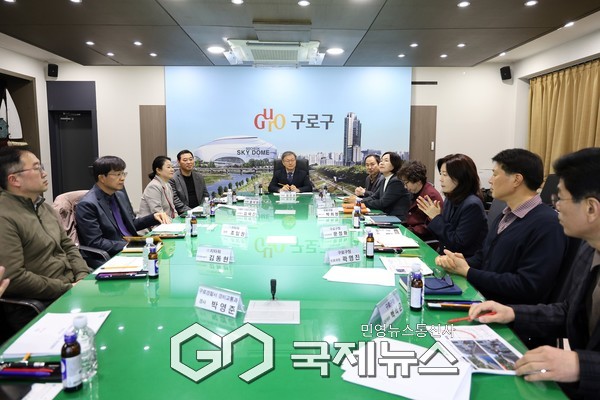 장인홍 구로구청장과 참석자들이 ‘G-밸리 생활권 보행환경 종합정비사업 중간보고회’에서 보고 내용을 청취하고 있다. [사진제공=구로구청] |