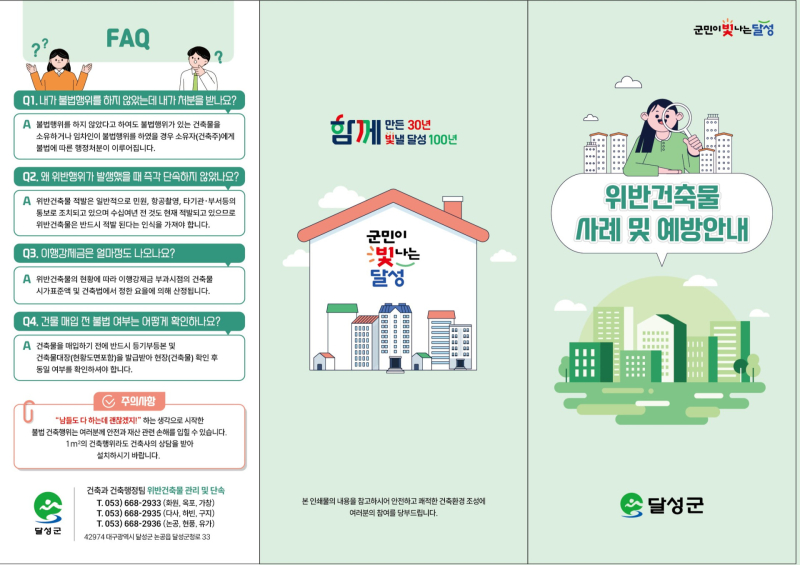 달성군은 이러한 피해를 예방하기 위해 올해 처음으로 불법건축물 예방 홍보지를 제작해 배부한다.