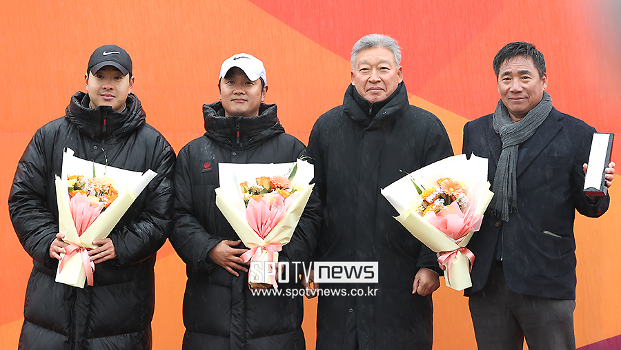 우수 지도자상을 수상한 경희대 김광진 감독(오른쪽)이 코치진과 기념 촬영을 하고 있다.