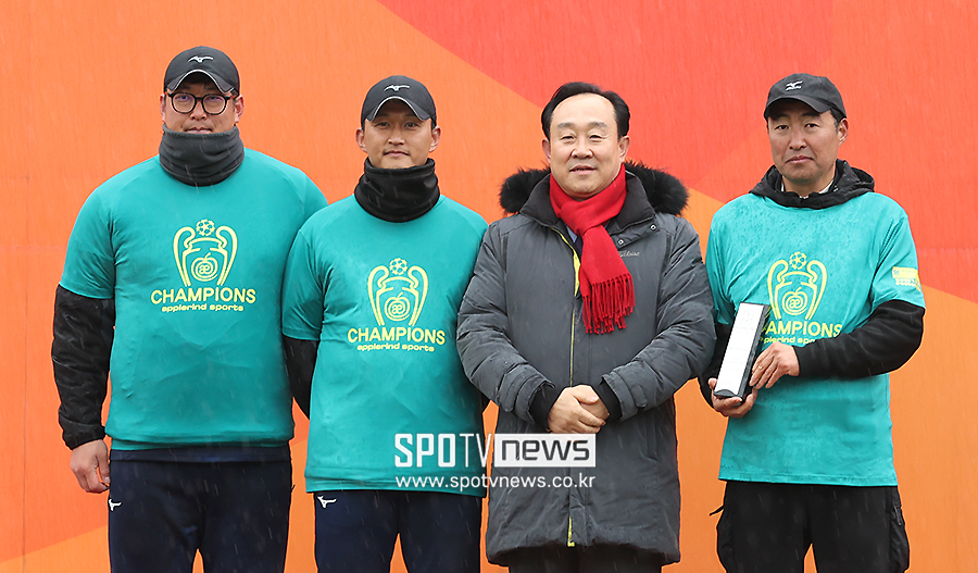 최우수 지도자상을 수상한 연세대 최태호 감독(오른쪽)이 코치진과 기념 촬영을 하고 있다.