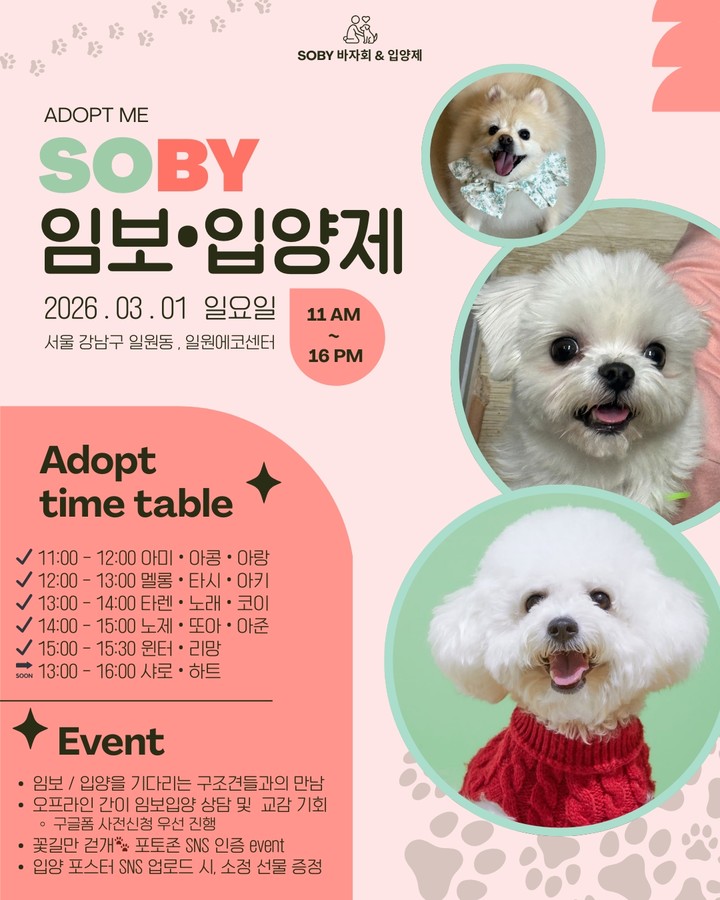 둘째 날에는 유기견 입양제가 함께 진행된다. 김장훈은 지난해 말 쏘바이를 통해 구조견 '보에'를 직접 입양한 바 있다. 이후 그는 SNS를 통해 보에를 향한 애정과 함께 보내는 일상을 공개하며 팬들과 소통하고 있다.