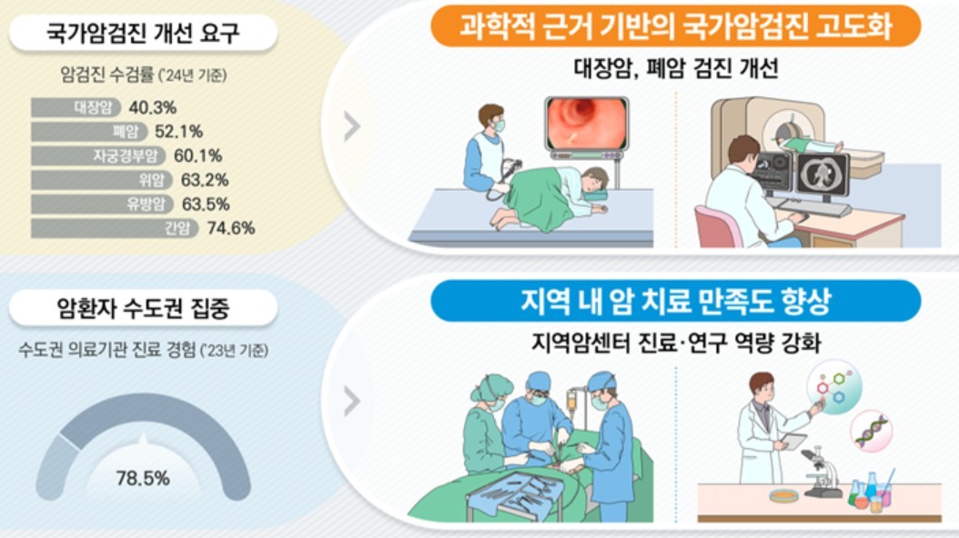 지역 암 의료 격차도 문제다. 복지부에 따르면, 신규 암 환자 중 수도권 거주자는 48.9%이지만 수도권 소재 의료기관 진료 경험이 있는 암 환자는 78.5%로 1.6배다. 복지부는 2027년부터 현재 운영되고 있는 지역암센터가 지역 암 의료를 선도할 수 있도록 명칭을 권역암센터로 변경한다.