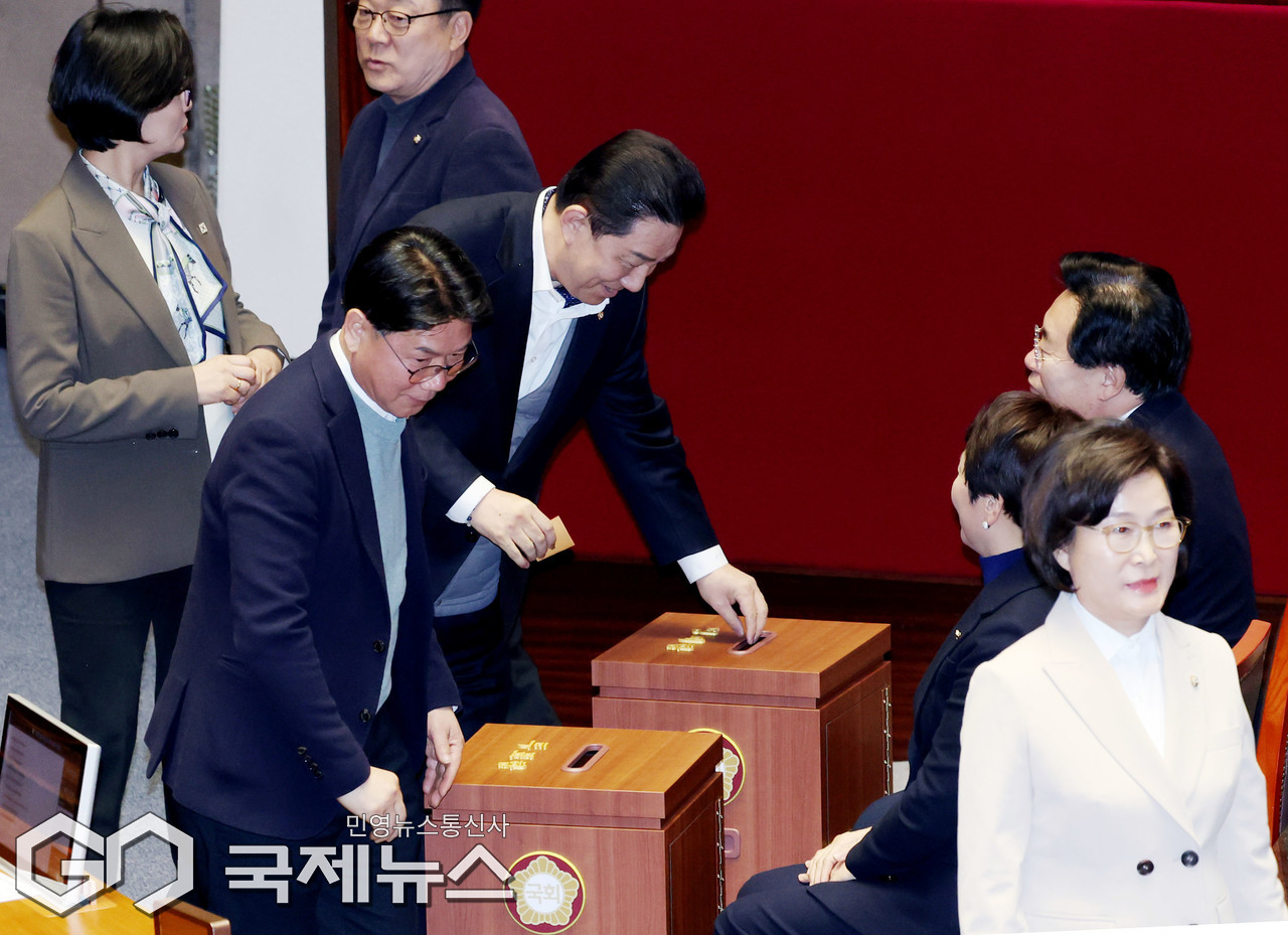 (서울=국제뉴스) 김병기 의원이 24일 오후 서울 여의도 국회에서 열린 본회의에서 강선우 의원에 대한 체포동의안에 대한 투표를 하고 있다./사진=이용우 기자
