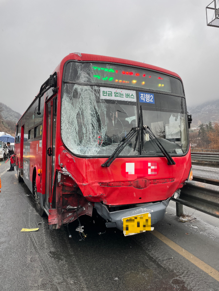24일 오후 3시 30분쯤 대구 달성군 유가읍의 한 도로에서 버스가 눈길에 미끄러져 사고가 났다. 대구소방안전본부 제공 |