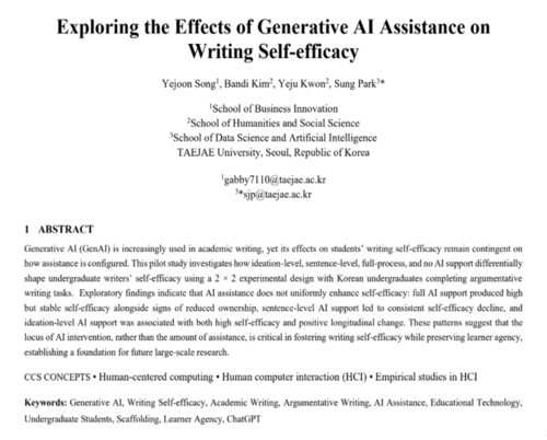태재대학교는 송예준, 김반디, 권예주 학생의 연구 논문 'Exploring the Effects of Generative AI Assistance on Writing Self-efficacy'이 인간과 컴퓨터 상호작용(Human-Computer Interaction, HCI) 분야 최고 권위 학술대회인 '2026 ACM CHI Conference on Human Factors in Computing Systems'의 Posters(Short Paper·단편논문) 부문에 최종 선정됐다고 24일 밝혔다. 올해 해당 트랙의 최종 채택률은 38.4%다.
