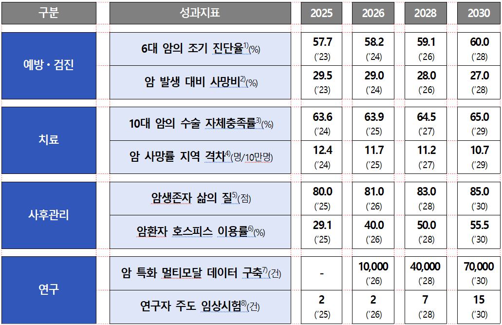 정부는 2030년까지 ▲6대 암 조기진단율 60.0% ▲10대 암 수술 자체충족률 65.0% ▲암생존자 삶의 질 85점 ▲암 특화 멀티모달 데이터 7만건 구축을 핵심 성과지표로 제시했다.