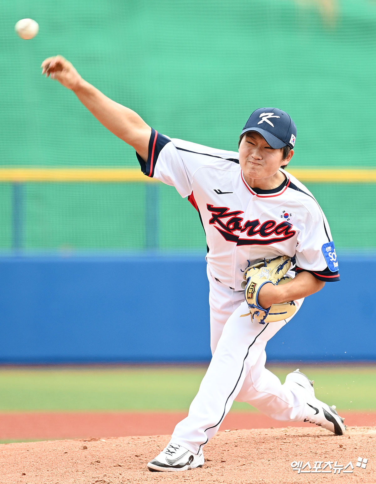 (엑스포츠뉴스 오키나와(일본), 고아라 기자) 24일 일본 오키나와 카데나 구장에서 열린 KIA 타이거즈와 WBC 대표팀의 연습경기, 6회초 대표팀 김택연이 공을 힘차게 던지고 있다.