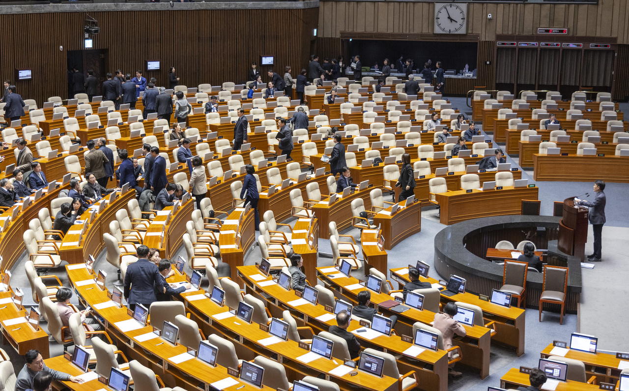 국민의힘 윤한홍 의원이 24일 국회에서 열린 2월 임시국회 8차 본회의에 3차 상법개정안이 상정된 뒤 이 법안에 대한 필리버스터(무제한 토론)을 시작하고 있다. 국민의힘의 무제한 토론이 시작되자 더불어민주당 등 의원들이 본회의장을 떠나고 있다. <연합뉴스> |