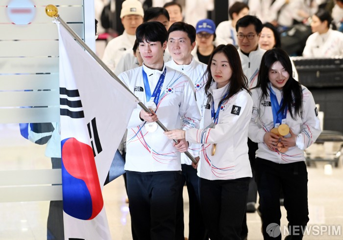 [영종도=뉴스핌] 류기찬 기자 = 밀라노·코르티나담페초 동계 올림픽을 마친 대한민국 선수단이 24일 인천공항을 통해 귀국했다. 황대헌(왼쪽)과 최민정이 태극기를 들고 이동하고 있다. 오른쪽은 김길리 선수. 2026.02.24 ryuchan0925@newspim.com