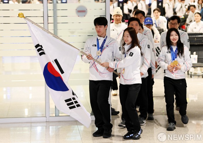 [영종도=뉴스핌] 류기찬 기자 = 밀라노·코르티나담페초 동계 올림픽을 마친 대한민국 선수단이 24일 인천공항을 통해 귀국했다. 황대헌(왼쪽)과 최민정이 태극기를 들고 이동하고 있다. 오른쪽은 김길리 선수. 2026.02.24 ryuchan0925@newspim.com
