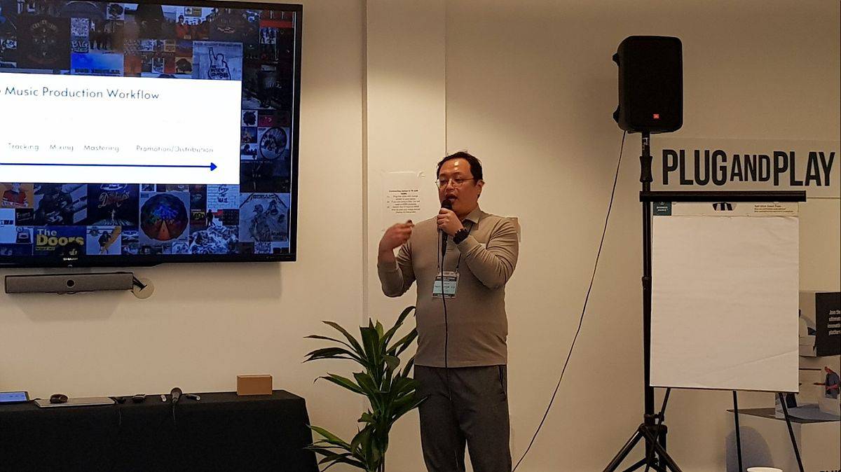 미국 실리콘밸리 플러그 앤 플레이 IR에서 기술을 소개하는 고남욱 보이스매치 대표 / 출처=보이스매치 |