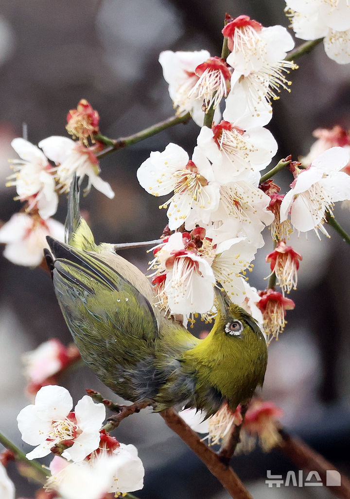 [서울=뉴시스] 봄을 재촉하는 비가 내린 24일 부산 수영구 수영사적공원을 찾은 동박새가 활짝 핀 매화나무에서 먹이활동을 하고 있다.
