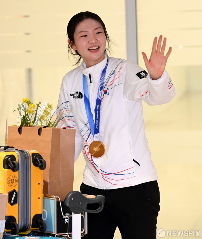 [영종도=뉴스핌] 류기찬 기자 = 쇼트트랙 선수 심석희가 24일 밀라노·코르티나담페초 동계 올림픽을 마치고 인천공항을 통해 귀국하고 있다. 2026.02.24 ryuchan0925@newspim.com