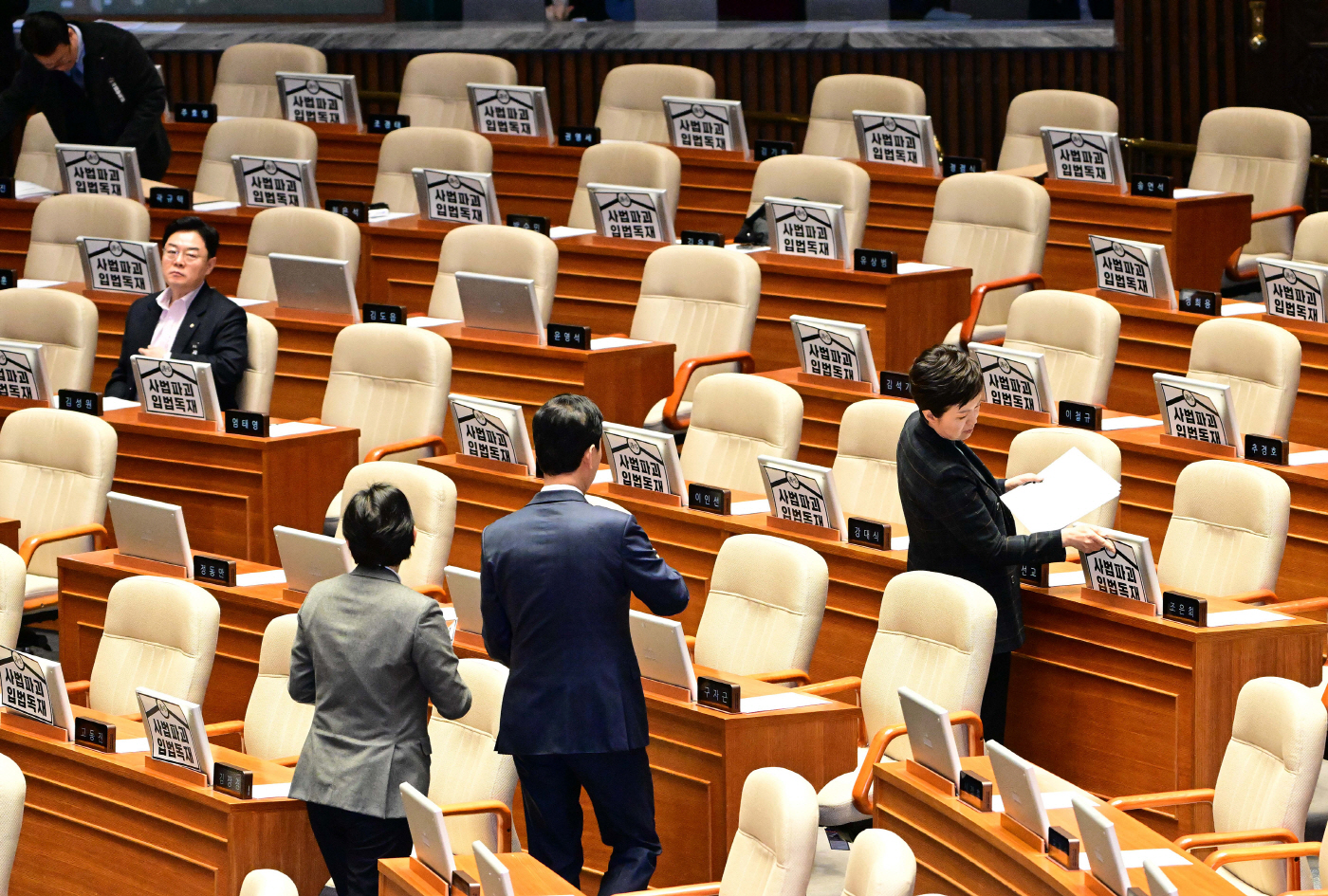 국민의힘 의원들이 24일 국회에서 열린 본회의에서 모니터 앞에 '사법파괴 입법독재'라고 적힌 피켓을 붙이고 있다. /이병화 기자 photolbh@ |