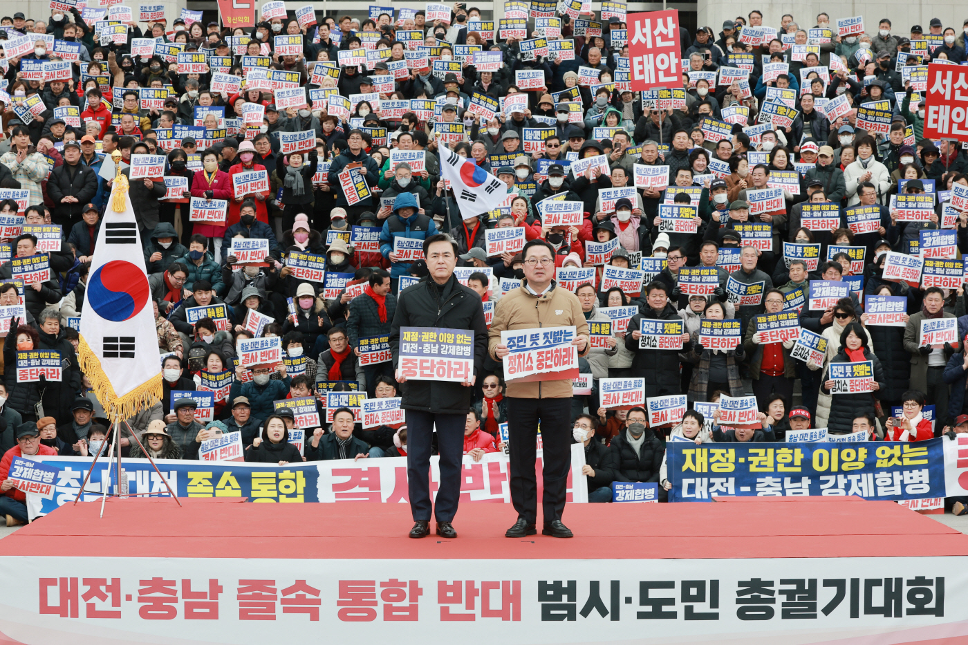 김태흠 충남지사(앞줄 왼쪽)와 이장우 대전시장이 24일 국회 본청 앞 계단에서 열린 '대전·충남 졸속 통합 반대 범 시·도민 총궐기대회'에 참석해 손팻말을 들고 있다. /연합 |