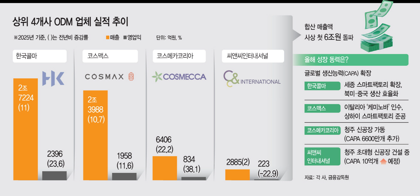 K뷰티의 숨은 주역인 국내 화장품 ODM(제조자개발생산) 4사가 사상 처음으로 합산 매출 6조원을 돌파했다. 주 고객사인 K뷰티 업체들이 국내외에서 고성장을 이어가면서, 생산을 맡은 ODM 업체들의 실적도 동반 개선된 결과다. 대기업이 기획·생산·브랜드를 모두 내부화하던 과거와 달리, 최근에는 생산 설비가 없는 인디 브랜드가 시장을 주도하면서 성장 과실이 제조 파트너인 ODM으로 이동하는 구조가 굳어졌다는 분석이 나온다.