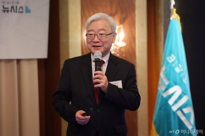 김석동 전 금융위원장이 지난 4일 오전 서울 중구 롯데호텔에서 열린 제1기 뉴시스 금융 아카데미 졸업식에서 '미래를 개척하는 한민족 DNA'를 주제로 강연하고 있다. /사진=뉴시스 |