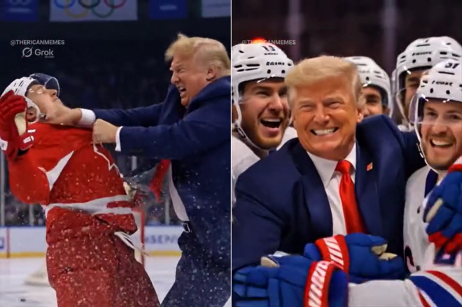 도널드 트럼프 미국 대통령이 23일(현지시간) 자신의 트루스소셜 계정에 올린 인공지능(AI) 생성 영상 일부. 영상 속 미국 아이스하키 대표팀으로 분한 트럼프 대통령이 캐나다 선수를 주먹질로 때려눕히는 모습(왼쪽)과 결승골을 넣은 후 미국 선수들과 승리를 기뼈하는 모습. 트럼프 대통령 트루스소셜 캡처 |