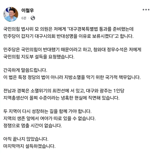 이 지사는 "국민의힘 법사위 모 의원은 저에게 '대구경북특별법 통과를 준비했는데 민주당이 갑자기 대구시의회 반대 성명을 이유로 보류시켰다'고 한다"며 "민주당은 국민의힘이 반대했기 때문이라고 하고, 청와대 정무수석은 저에게 국민의힘 지도부 설득을 요청했다"고 전했다.