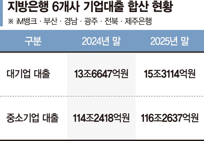 이와 반대로 지방은행의 주력 분야인 중소기업대출 성장세는 사실상 제자리걸음이다. 같은 기간 6개 은행의 중소기업대출 잔액은 114조2418억원에서 116조2637억원으로 1.8% 증가에 그쳤다. 전체 기업대출 잔액은 생산적금융 기조에 맞춰 약 3조원 늘어난 133조 8122억원을 기록했으나 대기업 위주의 선별적 지원이 이뤄졌다는 평가다.