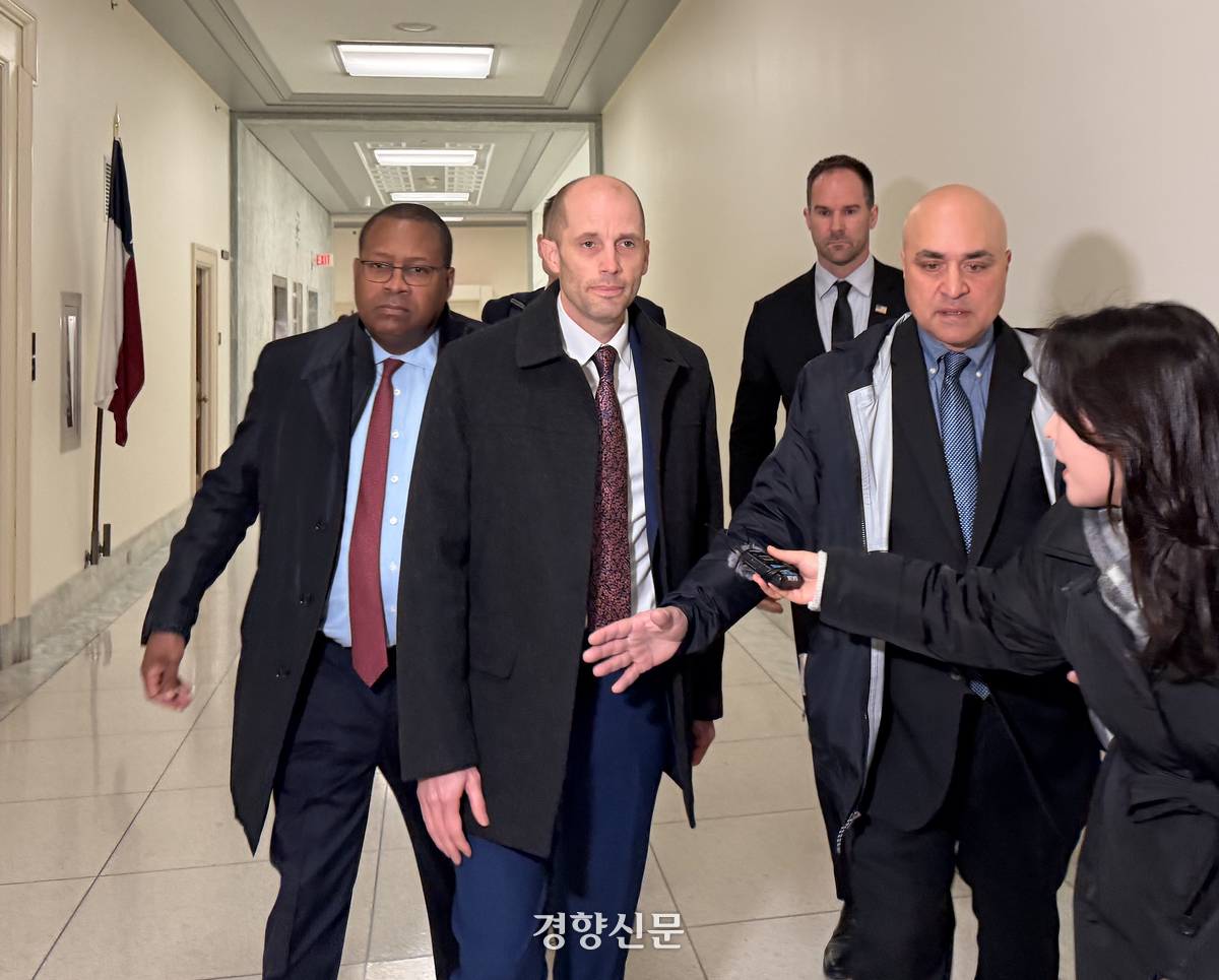 해롤드 로저스 쿠팡 한국법인 임시 대표(왼쪽 두번째)가 23일(현지시간) 미국 워싱턴 연방 하원 법사위 회의장에 비공개 증언을 하기 위해 들어가고 있다. 워싱턴||정유진 특파원 |