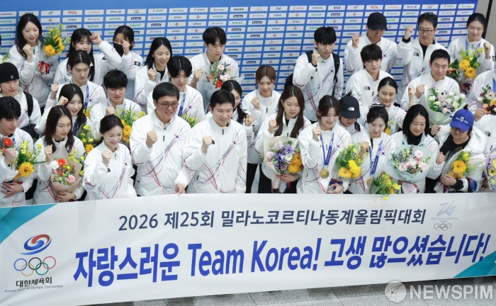 [영종도=뉴스핌] 류기찬 기자 = 2026 밀라노-코르티나담페초 동계올림픽을 마친 대한민국 선수단이 24일 오후 인천국제공항 제2여객터미널에서 귀국 인사를 하고 있다. 2026.02.24 ryuchan0925@newspim.com
