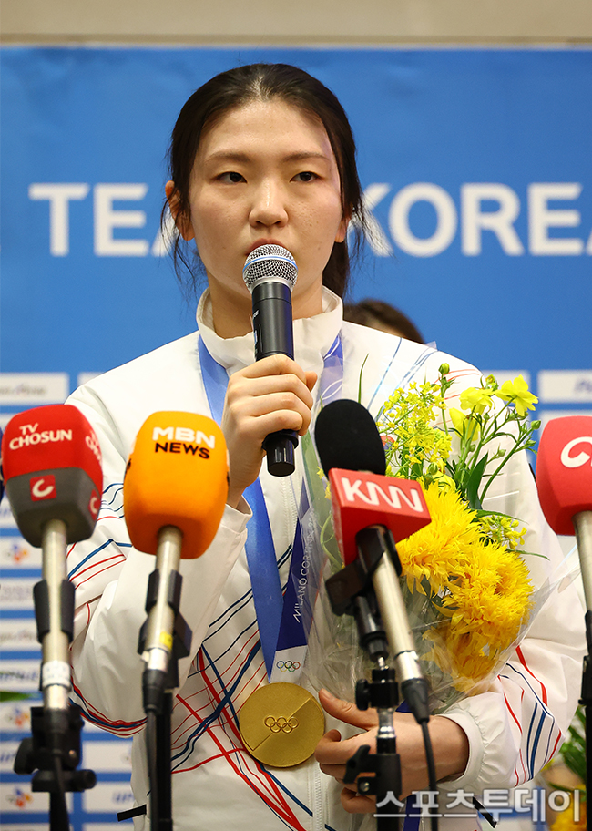 [인천공항=스포츠투데이 팽현준 기자] 쇼트트랙 심석희가 밀라노 코르티나 동계올림픽을 끝내고 24일 인천국제공항을 통해 귀국해 인터뷰를 하고 있다. 2026.02.24.
