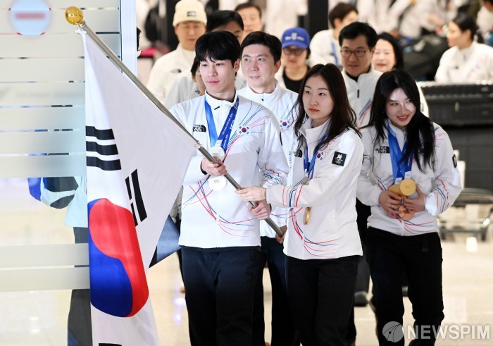 유승민 대한체육회장과 이수경 선수단장, 쇼트트랙·스피드스케이팅·피겨스케이팅·봅슬레이·컬링 대표팀이 함께 입국했다. 폐회식 기수였던 최민정과 황대헌이 태극기를 들고 앞장섰다.