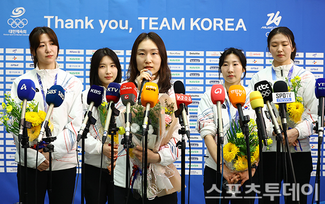 [인천공항=스포츠투데이 팽현준 기자] 쇼트트랙 여자대표팀이 밀라노 코르티나 동계올림픽을 끝내고 24일 인천국제공항을 통해 귀국해 인터뷰를 하고 있다. 2026.02.24.