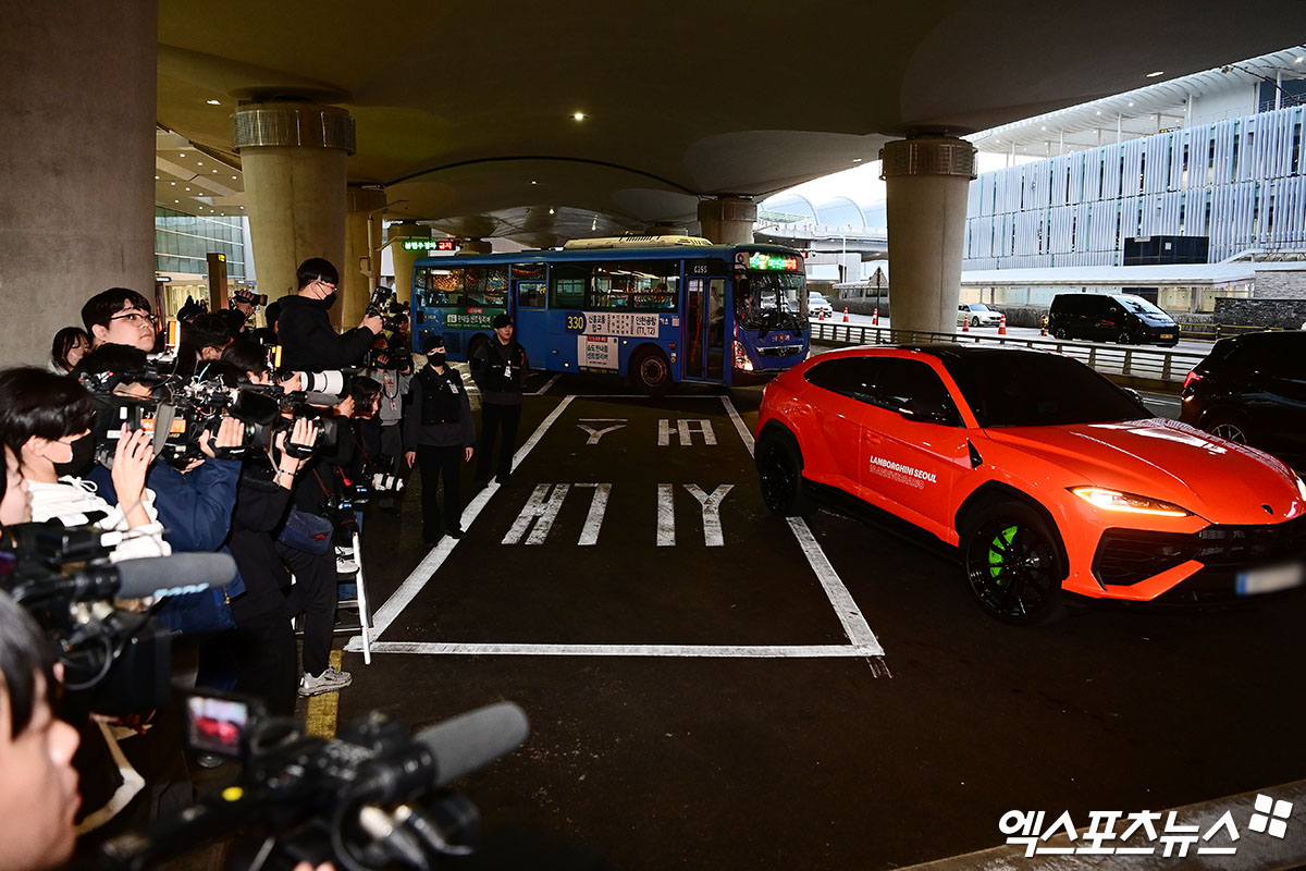 쇼트트랙 여자 대표팀 김길리를 태운 람보르기니 차량이 공항을 빠져나가고 있다.