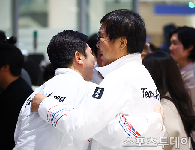 [인천공항=스포츠투데이 팽현준 기자] 유승민 대한체육회장이 밀라노 코르티나 동계올림픽을 끝내고 24일 인천국제공항을 통해 귀국해 최휘영 문체부 장관과 포옹을 하며 인사를 나누고 있다. 2026.02.24.