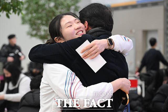 [더팩트 | 인천국제공항=김성렬 인턴기자] 2026 밀라노·코르티나담페초 동계올림픽을 마친 쇼트트랙 심석희가 24일 오후 인천국제공항으로 귀국해 가족과 포옹하고 있다.