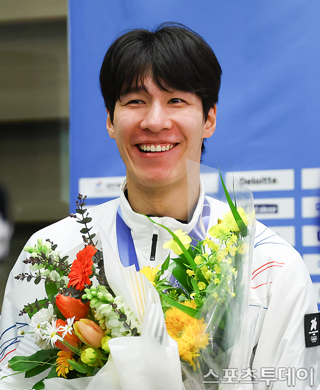 [인천공항=스포츠투데이 팽현준 기자] 쇼트트랙 황대헌이 밀라노 코르티나 동계올림픽을 끝내고 24일 인천국제공항을 통해 귀국해 포즈를 취하고 있다. 2026.02.24.