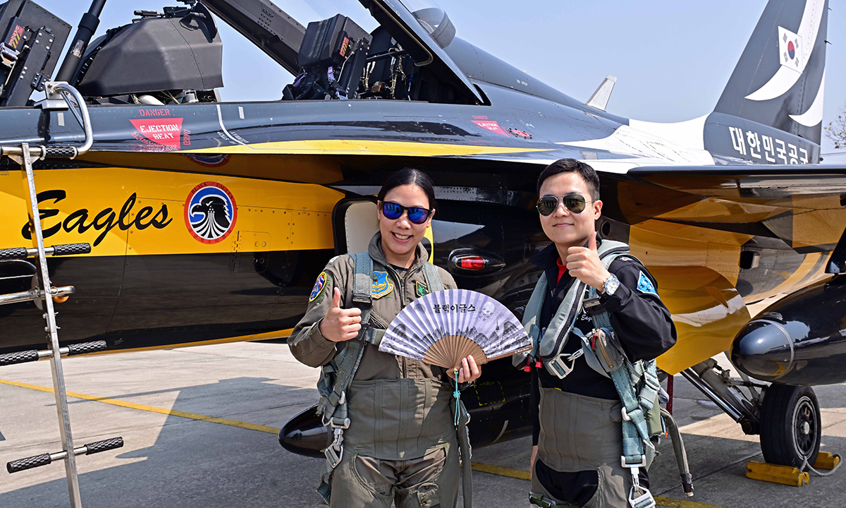 사우디아라비아 수도 리야드에서 열린 ‘2026 국제방산전시회’(WDS)에 참가 후 한국으로 복귀하던 중 태국 치앙마이 기지에 들른 공군 특수비행팀 블랙이글스 소속 김주호 대위(오른쪽)가 지난 18일 ‘한·태국 공군 우정비행’을 함께한 깐차녹 짠야락 소령에게 전통 부채를 선물한 뒤 기념 촬영을 하고 있다.
