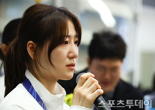 [인천공항=스포츠투데이 팽현준 기자] 쇼트트랙 노도희가 밀라노 코르티나 동계올림픽을 끝내고 24일 인천국제공항을 통해 귀국해 인터뷰를 하고 있다. 2026.02.24.
