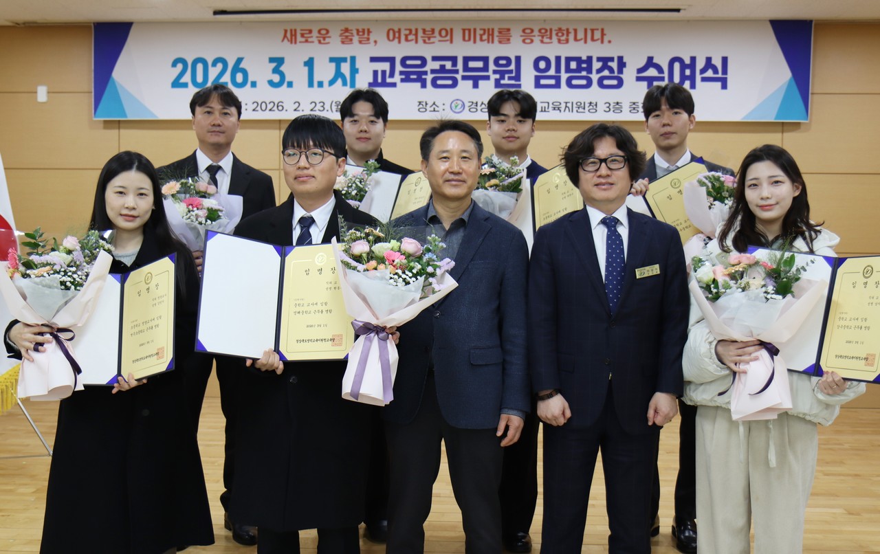 (영덕=국제뉴스) 김충남 기자 = 영덕교육지원청 이성호 교육장은 2월 23일 영덕교육지원청 3층 중회의실에서 진행된 임명장 수여식에서 늘봄지원실장 1명, 초등학교 교사 2명, 중학교 교사 4명에게 임명장을 전달하고 기념사진촬영을 진행하고 있다.