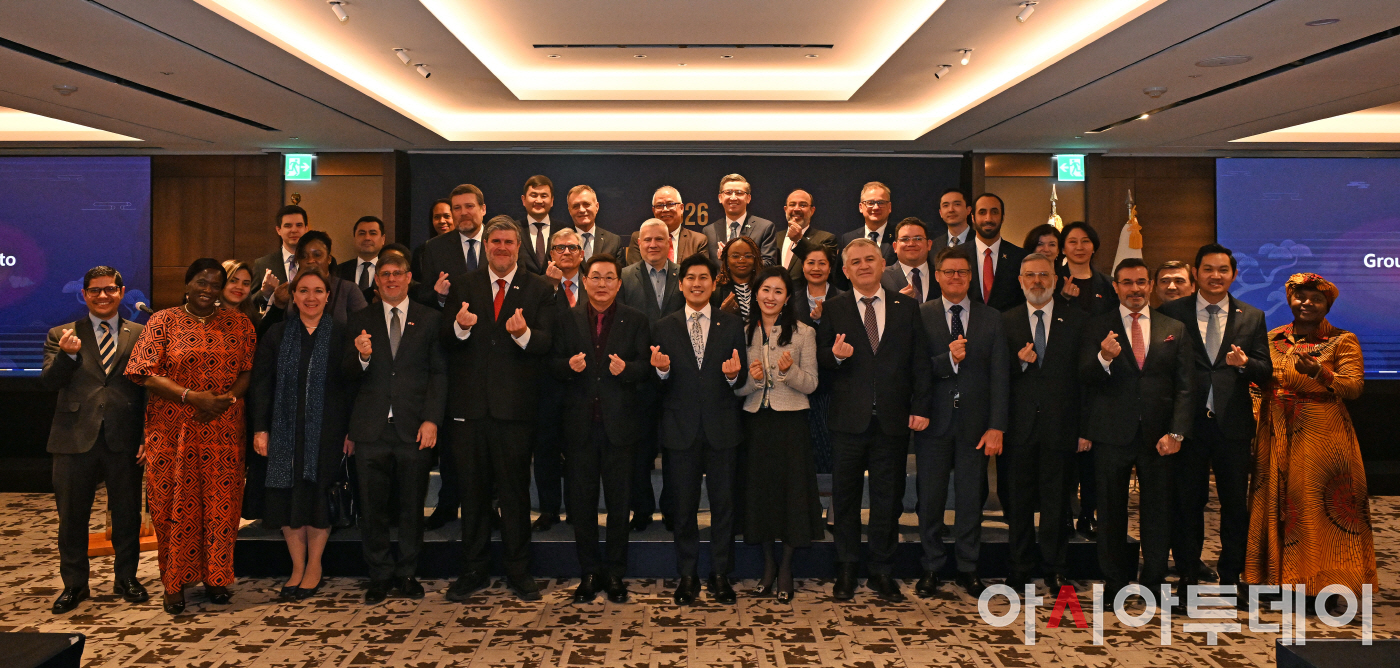 아시아투데이 송의주 기자 = 우종순 아시아투데이 대표이사·회장(맨 앞줄 왼쪽에서 여섯번째)과 정사무엘 한문화진흥협회 회장(일곱번째)을 비롯한 40여개국 대사 및 내빈들이 24일 서울 중구 롯데호텔에서 열린 2026 주한 외교사절단 초청 신년 리셉션에서 기념촬영을 하고 있다.