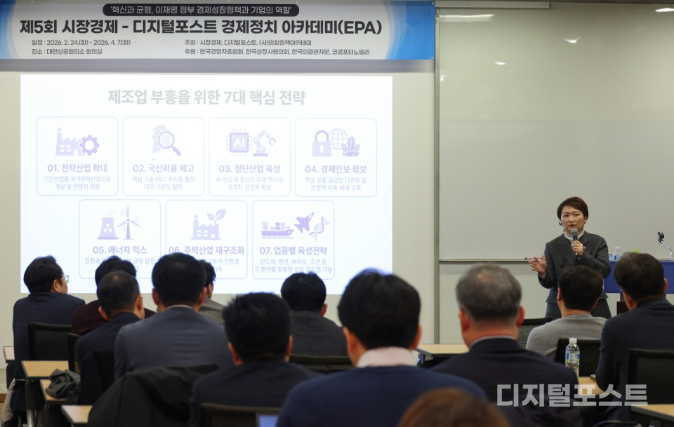[디지털포스트(PC사랑)=김성수 기자] 이언주 더불어민주당 수석최고위원(경기 용인정·3선)이 24일 오후 서울 중구 대한상공회의소에서 열린 '제5회 시장경제-디지털포스트 경제정치 아카데미(EPA)에서 강연을 하고 있다. 시장경제, 디지털포스트, (사)의회정책아카데미가 주최하고 한국경영자총협회, 한국상장사협의회, 한국의결권자문, 코콤포터노벨리가 후원하는 경제정치 아카데미는 2월 24일부터 두 달간 '혁신과 균형, 이재명 정부 경제성장정책과 기업의 역할' 주제로 진행된다.